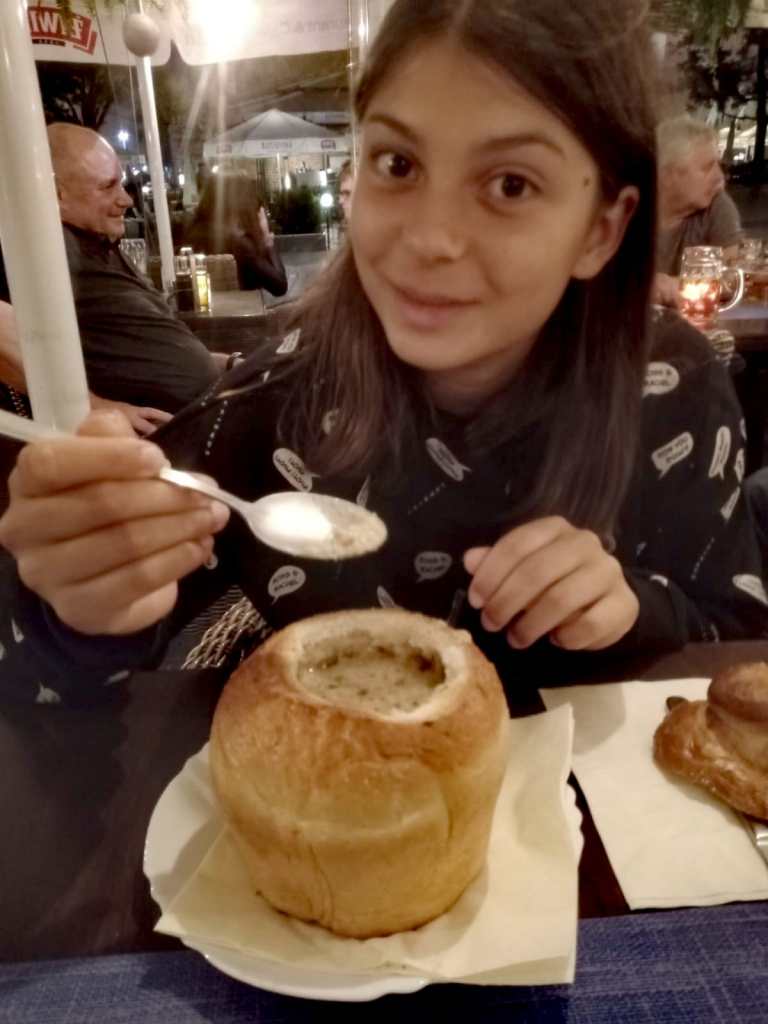 Esta es la famosa sopa Goulash servida dentro del pan. Deliciosa.
